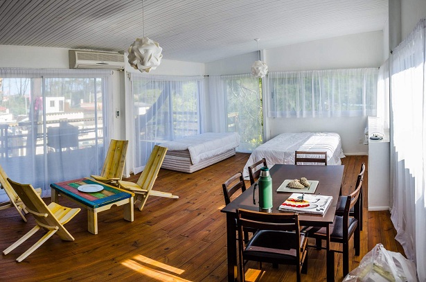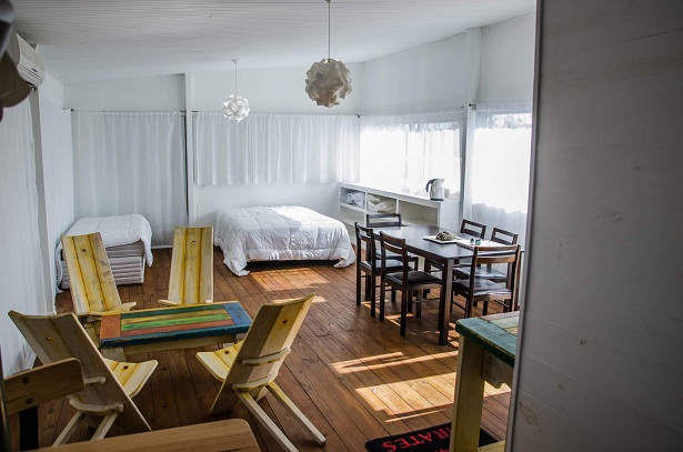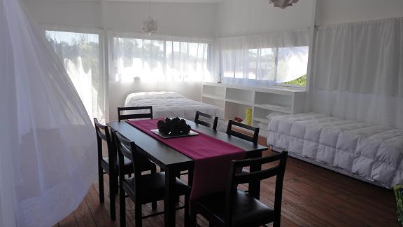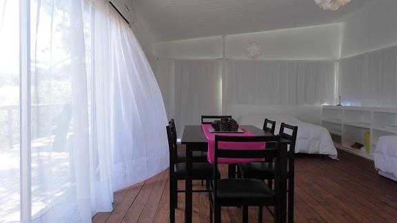 Monoambiente de construcción liviana con kitchenette, baño completo y terraza.