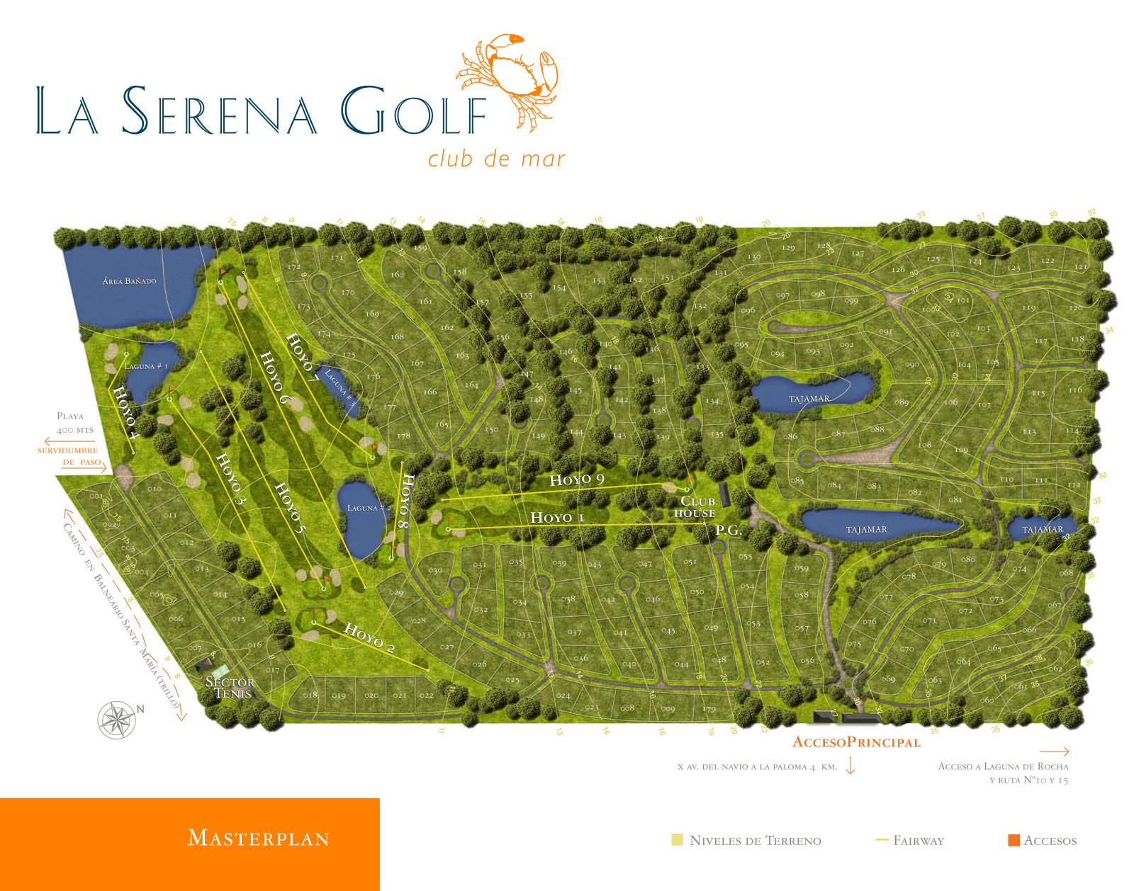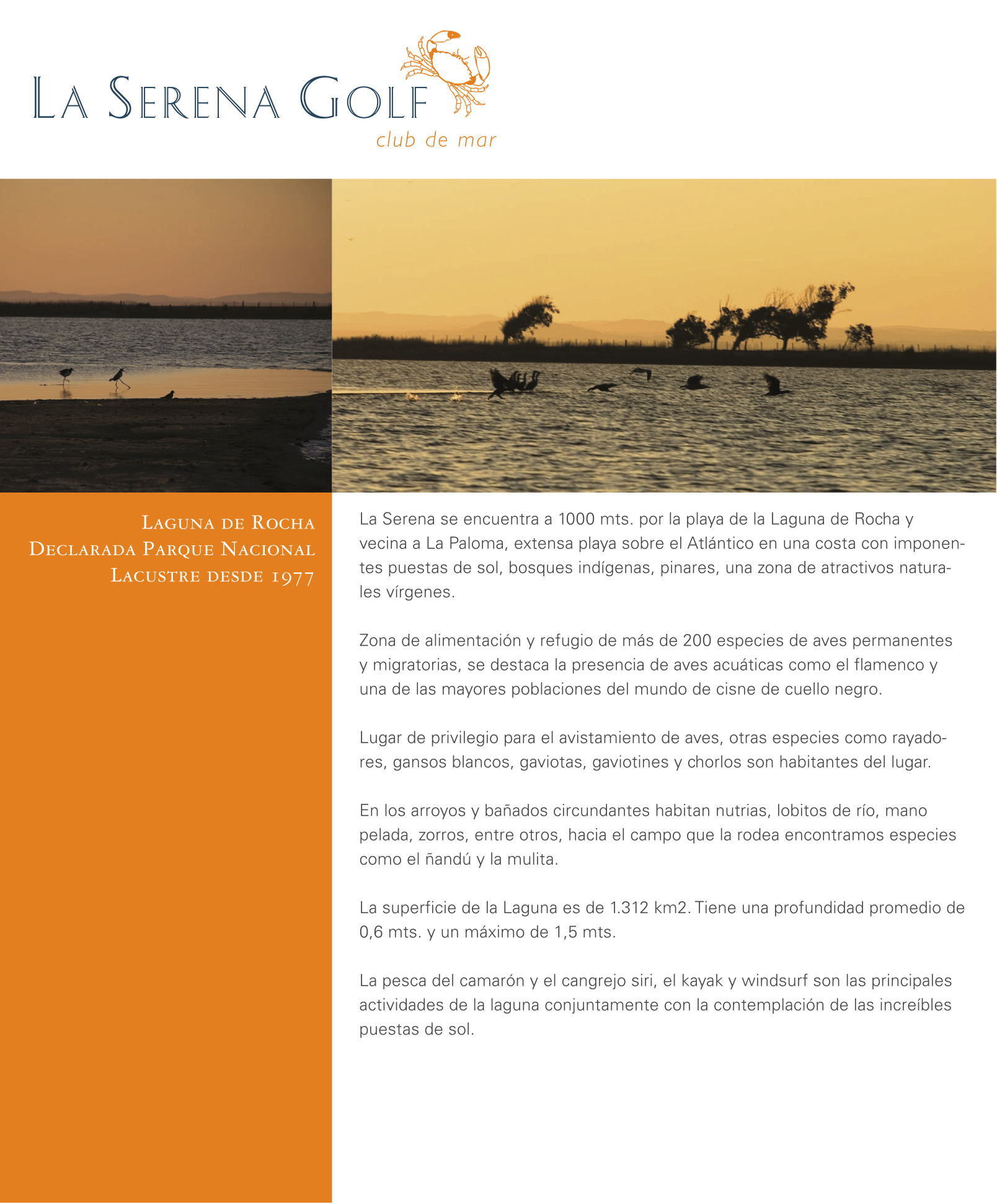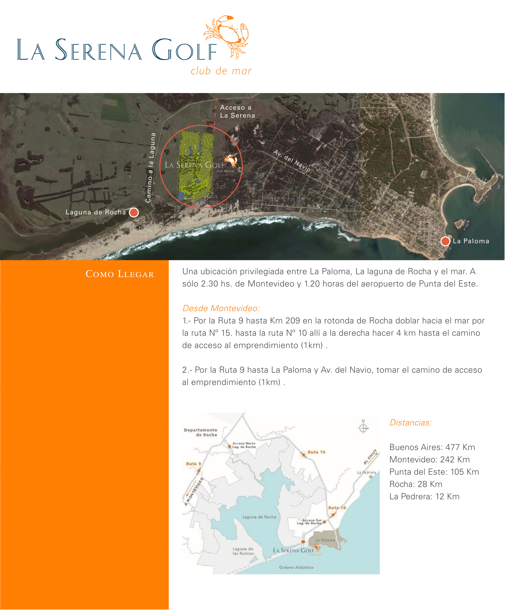 En una de las zonas de mayor re-valorización en los últimos años de La Paloma, departamento de Rocha. Uruguay. PRIMER CAMPO DE GOLF EN EL DEPARTAMENTO DE ROCHA.Tiene previsto que el 55% del total de hás esté destinado a espacios comunes, golf, tajamares, canchas de tenis, senderos ecuestres. En infraestructura de servicios contará con, electricidad subterránea, tendido vial de 6 km , casa de caseros, cancha de golf de 9 hoyos, canchas de tenis, senderos ecuestres, 6 hás de lagunas y Club House. Son 91 hás paradisíacas con lotes de 2000 a 3000 m2 en un entorno de ensueño, con espectaculares vistas al mar, a los tajamares, golf y atardeceres. La calidad del emprendimiento se funda tanto en la división de la tierra, como en los desarrollos a incorporar en el mismo que serán un atractivo complementario a los valores existentes en el entorno de la Laguna de Rocha. LA SERENA GOLF comienza su comercialización para posicionarse como uno de los más exclusivos de la zona. Los valores de los lotes varían dependiendo de sus características.